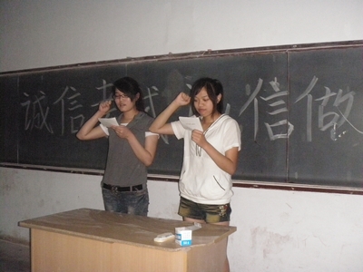 本次班会由两个班的学习委员张迪和宁康丽同学主持。同学们畅所欲言,就“诚信考试,诚信做人”这一主题进行了深入的讨论,认为“诚信”是一个古老而永恒的话题,它是中华民族优良的传统美德。树道德之新风,立诚信之根本,是当代大学生义不容辞的责任。关于作弊原因,作弊手法以及大学生考试作弊的后果,同学们都谈出了自己的看法。有同学指出:诚实守信既是公民的基本道德要求,更是每一个学生应具备的基本素质。考试不仅是一场文化知识的较量,更是一场道德品质的较量,直接关系到个人素质的提高和良好品德的养成。有的同学还提出一定要严肃考场纪律,严惩舞弊者。