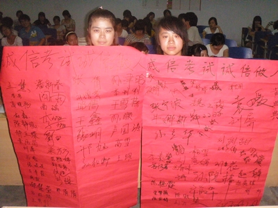 最后,主持人鼓励大家从我做起,严肃考风考纪,杜绝舞弊行为,还考场一片纯净天空,为自己赢得一个真实成绩。大家在诚信的红纸上签名,告诫自己,时刻都要做到诚信,是警钟也是诺言。
