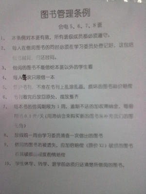 高尔基说过,书是人类进步的阶梯。有了它,我们可以使知识共享,情感得到抒发。一本好书可以改变人的一生。正是由于书籍的用途,并且为了丰富学生的课余生活,在辅导员赵焕丽老师的指导下,2010级会电5-8班经过两周的准备工作,班级图书角终于成立了。