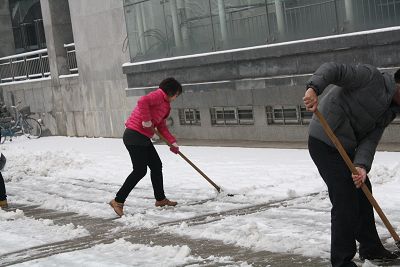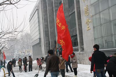 2012年12月20日晚上的一场降雪,大地银装素裹,美不胜收,给我们带来了惊喜。可是雪景虽美却给广大师生的出行带来了大麻烦,整个学校路面上积起了厚厚的雪。为了方便老师与同学们出行,财贸学院广大师生一大早就组织人员拿起扫把,清扫校园主干道内的积雪。在大家的齐心努力下,很快就把校园主干道上的积雪清理干净了。在严寒的冬天温暖着广大师生的心......