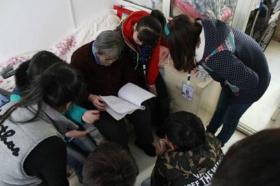 一位87岁高龄的老奶奶精神抖擞,饶有回味的给我们讲解放战争时期的岁月和她年轻时期的生活,告诉我们要珍惜今天的幸福生活。老奶奶还为我们演唱了一首老歌,志愿者们轻轻地为老人打着节拍,静静地听老人重温岁月的旋律。