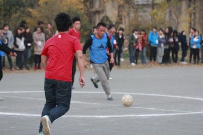赛前,啦啦队队员们早已赶到小操场为在各自的球队加油。在赛场上也形成了一道靓丽的风景线。场上我院队员身着热情的红色队服,建工院队员身着蓝色球服。随着裁判哨声的响起,双方队员立刻投入对决。经过激烈的角逐,上半场比赛结束时,我院的足球健儿们暂时落后于工商管理学院。虽然上半场失利,但我们系队员仍斗志昂扬,毫不气馁。经过短暂的休息之后,双方又开始了新一轮的较量,在短短的十分钟我方将比分追平。之后两方势均力敌,难分上下。令人万分惋惜的是临近结束时由于我方一队员不慎受伤,最终惜败