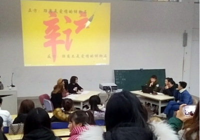 2018年1月5号我们财贸院举行了18年的第一次辩论赛“贸之辩”。在辩场上同学们的唇枪舌剑表演的十分精彩,每个部门都派上了自己部门最厉害的、最强大的阵容。台上的选手也都是个个的信心满满,都做了十分充足的准备。各部门的辩手们也都是极力的配合,他们妙语连珠、当仁不让。第一场辩论赛辩点是“距离是不是爱情的绊脚石”。首先开始了第一是环节----立论陈词。正反双方紧密围绕各自的观点展开了严谨有序的立论陈词。过程那是相当激烈。随后,进入了辩论赛最为激烈和精彩的环节----自由辩论。首先由正方发起提问,然后正反方交替发言,双方的成员们个个巧舌如簧、才思敏捷,在如火如荼的辩论中又不失礼仪的前提下,活动进行的十分顺利。接下来就是财贸院纪检部的大神们出场了,他们是围绕“当今世界竞争是否高于合作”这一论题展开辩论,纪检部部员个个唇枪舌剑,才思敏捷,毋庸置疑,这场“战争”纪检部完胜·····在经过轮轮精彩的辩论后,这场比赛即将接近尾声。