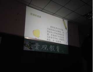 有多少人因为恋爱,丢失了自己,有多少人因为恋爱,确定了方向!2018年1月7日晚自习F312教室开了有关“恋爱观教育”的主题班会,辅导员详细的讲述了正确的恋爱观,端正恋爱态度,自尊,自爱,这也是每一位父母都希望自己的子女所做的,毕竟父母把你带来这个世界上,含辛茹苦把你养大,你恋爱了,以后要和别人分享自己的儿女,换位思考一下,现在你上大学了,不经常回家,父母们对你的期盼,对你的想念,你的恋爱占据了大量的时间,同时占据了你的思想。如果对方优秀便好,感染着你变得优秀,反之可想而知!
