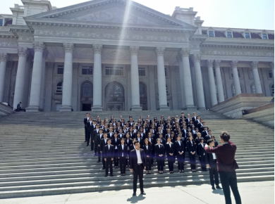 4月15日中午,大合唱比赛在山东圣翰财贸职业学院教学楼前举行。有各学院相关负责人、评委老师和参赛学生。