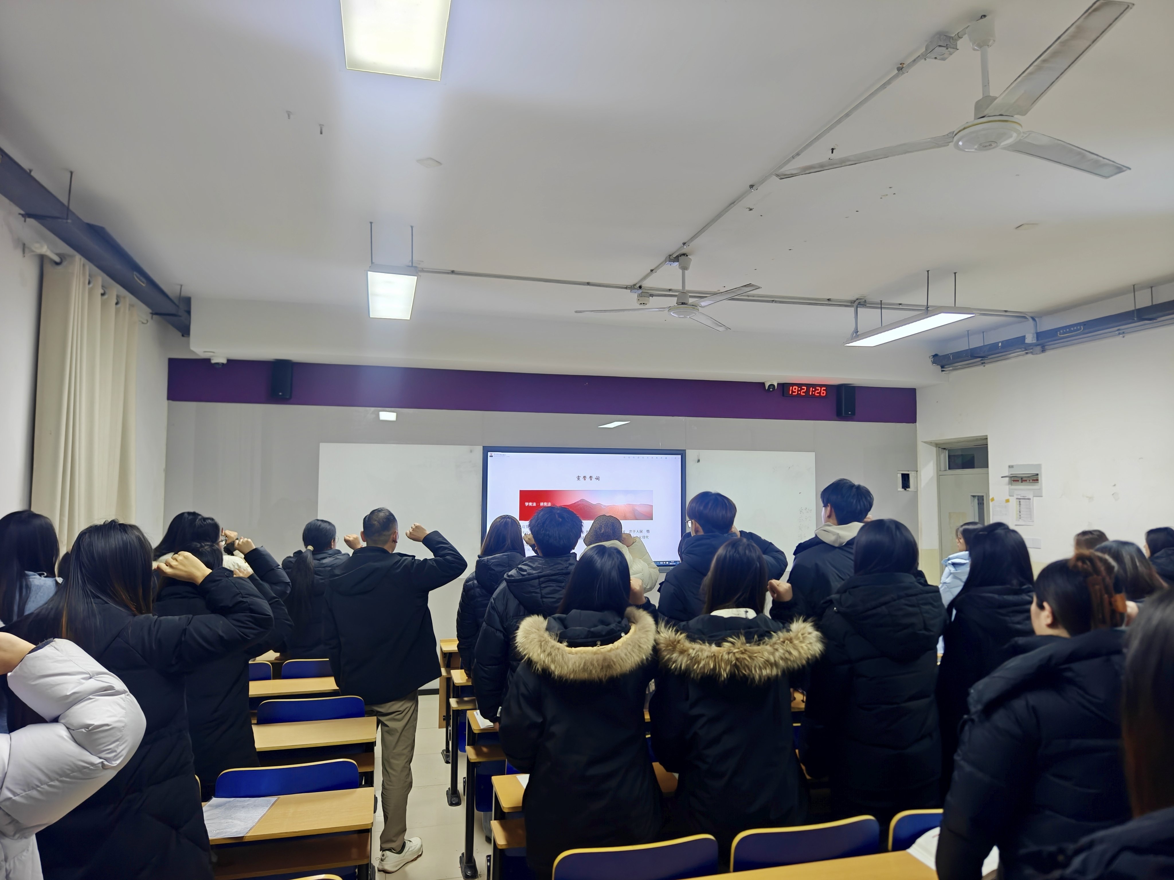 “我宣誓:忠于中华人民共和国宪法,维护宪法权威,履行法定职责……”近日,咏望楼自习室内气氛庄重肃穆,商学院“12·4国家宪法日-弘扬宪法精神·维护宪法尊严”主题教育班会在此举行。全体师生高举右拳,在辅导员李占贞老师的带领下进行庄严宣誓,铿锵誓言回荡在教室中,也将宪法精神深深镌刻在每一位学子心中。此次活动是商学院深入学习宣传贯彻习近平法治思想,以法治教育落实立德树人根本任务的生动实践。
