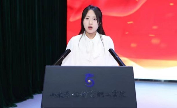 山东佳德信企业管理集团有限公司的优秀实习学生代表、2021级大数据与会计1班的王紫怡同学上台发言,王紫怡同学分享了她在该公司实习的经历,她有幸见证并参与了公司的转型升级和产教融合发展历程,通过实践项目和与企业合作,她更好地了解了所学专业在实际工作中的应用,为自己的职业目标规划和实现提供了有力支持。她讲述了在充满挑战的实习过程中茁壮成长的故事,表达了对学校、公司的感激之情。
