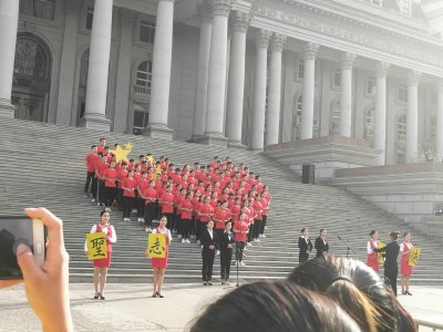比赛中,同学们以饱满的精神面貌、高涨的参与热情、宏亮的美妙歌声,抒发了同学们的爱国情怀,唱响了学生们的热血青春。跟随着指挥、同学们完美的配合、歌声或婉转,或激扬,或振奋,或高亢,或温婉。高举并高喊校训“圣志明德翰实博学”,整个现场的气氛活跃,高潮迭起。