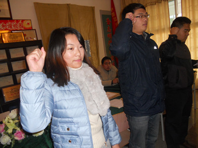 最后孔令梅同志要求全体党员举手表决,经过表决全体通过料位同学由入党积极分子转为预备党员,并上报上级党组织批准。由组织委员带领两位新同志面对党旗庄严宣誓。孔令梅同志对新加入党组织的两位同志提出了新的要求,要求他们在工作岗位上以身作则,要处处体现党员的先进性,在工作岗位中更好地发挥自己的作用。