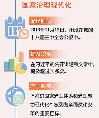 习近平对国家治理现代化的问题非常重视。2014年2月17日,在省部级主要领导干部学习贯彻十八届三中全会精神全面深化改革专题研讨班的开班式上,他主讲的就是这个话题。在中共中央政治局集体学习时,在纪念全国人民代表大会成立60周年大会、党的群团工作会议等多个重量级会议上,他都对这一概念进行了强调。而在出访德国、印度、美国等多个国家时,他还向海外专门做了介绍。