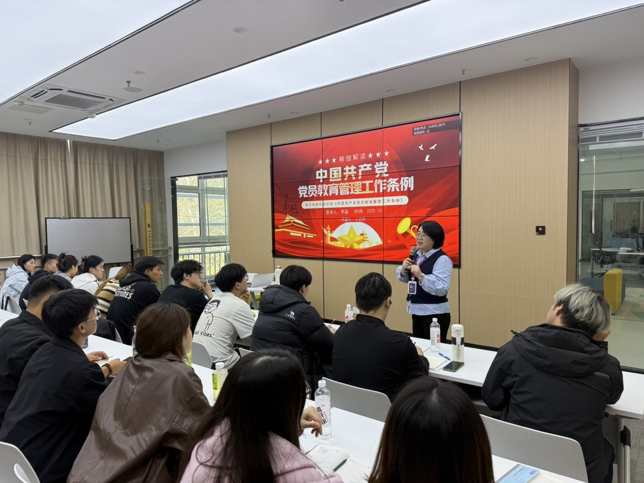 培训课堂上,王君萍书记以清晰的逻辑、生动的语言,将《条例》解读与青年学子成长紧密结合。她从《条例》出台的时代背景切入,结合党的十八大以来的辉煌成就,让学员深刻认识到党员教育管理工作的重要性;在讲解党员发展程序、组织关系管理等实操内容时,她结合自身参与党支部建设的经历,用“案例分析+疑问解答”的方式,帮助学员理清流程、规避误区。