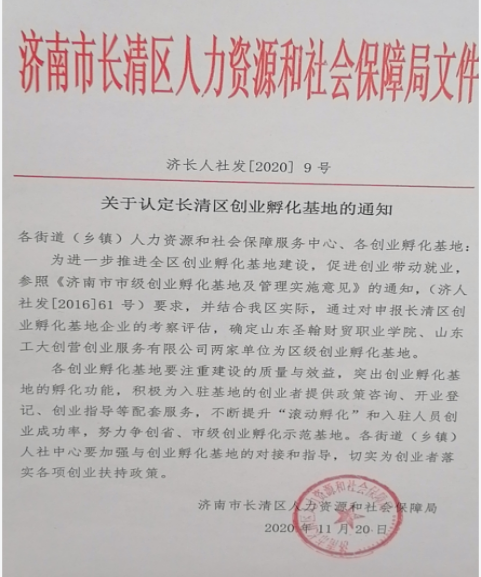 就业是民生之本,创业是就业之源。为了推进我校创业孵化基地建设,促进创业带动就业,激发创新创业活力,培育一批优秀的创业者,实现大众创业、万众创新的宏伟蓝图。我校创新创业学院结合学校实际,积极向长清区人力资源和社会保障局申报创业孵化基地,经长清区人力资源和社会保障局领导实地考察评估,于2020年11月20日认定我校为长清区创业孵化基地(济长人社发【2020】9号)。