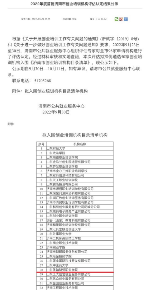 近日,在2022年度济南市人力资源和社会保障局组织的创业培训定点机构认定评审中,我校顺利通过考核评审,被认定为“济南市创业培训定点机构”。