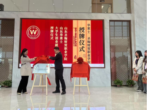 山东圣翰财贸职业学院与华莱士公司达成协议,双方共建“大学生创业就业实训基地”。创新创业学院院长盛雅欣与华莱士汉堡学院潘云峰校长共同参与揭牌仪式。