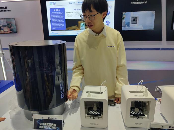 陈天润本科在浙江大学电子科学与技术专业学习。他喜欢和舍友讨论一些有趣的想法或问题,比如能不能让打印机实现移动化打印?又或者通过技术手段降低3D打印成本,甚至把3D打印机变成普通人的创意工具?在与同学、朋友对这些问题进行不断的探讨、思考和动手尝试的过程中,陈天润和他的团队越走越远,并走上了创业之路。类似的,在“共赴牧业——奶山羊智慧养殖开创者”项目展区,西安电子科技大学智能科学与技术专业本科生宋卓琛告诉澎湃新闻,他最初投身这个项目也是因为兴趣。
