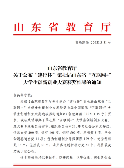 中国国际“互联网+”大学生创新创业大赛由教育部等部委及省级人民政府共同主办,是山东省创新创业类级别最高、参与度最广、影响力最大的比赛。本届大赛以“我敢闯,我会创”为主题,大赛吸引了省内136所高校、33所中职中专学校报名参赛,参赛项目20.33万项、参赛学生48.02万人,参赛学生人次达到89.1万,实现了区域、学校、学生类型全覆盖。