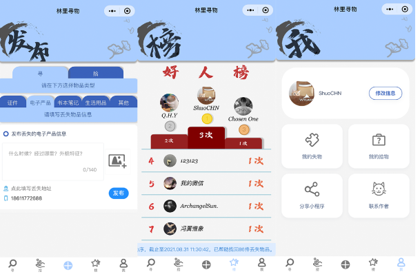 林里寻物项目致力于为在校学生提供失物找回、学习资料分享、竞赛组队等互助共享服务,课题的初衷是校园里尚没有集中统一的寻物平台,单凭在群聊和朋友圈中发布寻物启事,会产生信息整合性低、接收群体局限的问题;而且在隐私安全方面,现存的一些类似平台缺少身份认证系统和证件信息保护功能,极易造成用户信息泄露。在技术方面,我们以“实践推进技术,项目助力学习”为核心理念,不断增强自身技术实力,并应用于校园实际场景。在管理方面,重视团队合作,应用大厂的管理模式,提升团队效率。团队迄今获得多项国家级奖项,并被腾讯、新浪等多家媒体报道宣传。