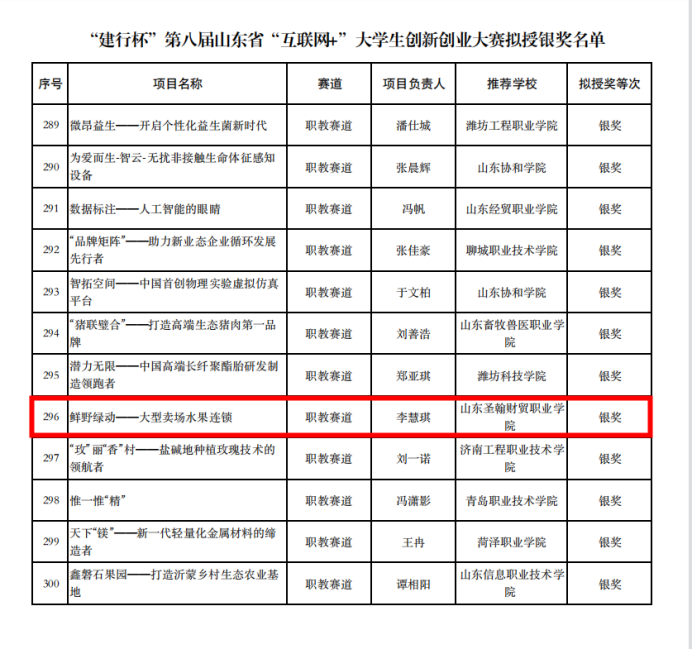 近日,“建行杯”第八届山东省互联网+大学生创新创业大赛总决赛圆满落下帷幕,经过激烈角逐和省复赛网评专家的严格评审,我校选送的“鲜野绿动—大型卖场水果连锁”从山东省复赛中脱颖而出,进入此次省决赛并斩获银奖。这是我校自去年参加该项赛事以来取得的历史最好成绩,也是学校双创教育取得的重要标志性成果,实现了我校在大学生创新创业大赛领域新的突破。