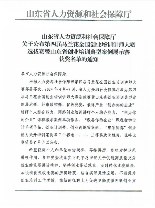 近期,山东省人力资源社会保障厅举办第四届马兰花全国创业培训讲师大赛选拔赛暨山东省创业培训典型案例展示赛。经市级初赛、省级决赛,最终产生“创办你的企业”讲师个人综合能力、网络创业培训讲师个人综合能力、“创办你的企业”课程教学案例单项作品、“改善你的企业”课程教学设计单项作品、创业计划书、创业训练营案例、“鲁菜师傅”创业能力提升培训案例等7个赛道一、二、三等奖及优胜奖。