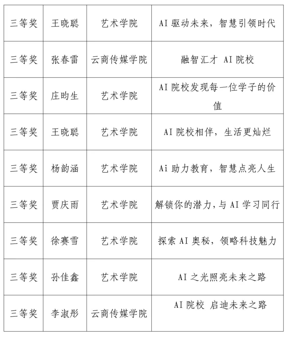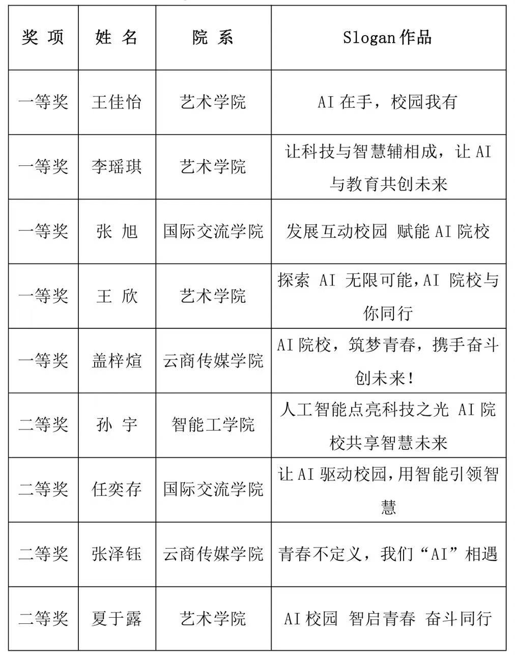 10月14日下午2:30,学校首届“AI 院校”Logo 及 Slogan 创意大赛决赛在创梦空间A演播室进行。本次大赛由创新创业学院和文化与宣传处共同主办。 大赛共收到来自全校师生的255个参赛作品,最终评选出获奖作品34个。其中获奖logo作品:一等奖5个、二等奖4个、三等奖7个;获奖slogan作品:一等奖5个、二等奖4个、三等奖9个。获奖作品推荐至省赛。