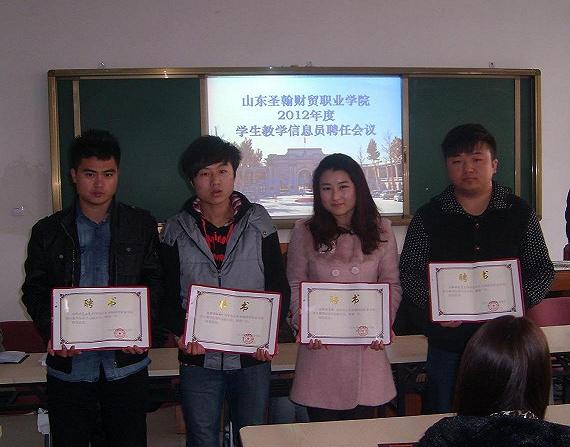 2012年2月28日下午4:00在综合教学楼F304隆重召开2012年度学生教学信息员聘任会议,会议聘任杜笑飞同学为学生教学信息中心主任,高升、张国伟、李焱、崔好亮4名同学为副主任,聘任八个学院的143名同学为2012年度的学生教学信息员。