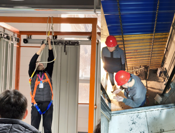 实训现场,在教师的指导下,学生们分组有序开展实训操作。基础实训项目,——下地坑对电梯底部设备进行检查与调试。同学们穿戴好安全帽、安全鞋等防护装备后,小心翼翼地顺着爬梯进入电梯地坑。地坑内空间狭小,光线相对昏暗,学生们拿着手电筒和各类检测工具,对照图纸,一丝不苟地检查缓冲器、限速器张紧装置等设备。现场指导的老师演示并时刻大声提醒安全注意事项。学生们一边聆听,一边认真操作,仔细记录数据。有的同学发现设备连接部位有轻微松动,在老师的引导下,迅速拿起扳手进行紧固;有的同学在检测过程中对某个参数存疑,便与小组成员热烈讨论,反复核对操作流程。学生反映实训课程让他们受益匪浅,不仅加深了对理论知识的理解,更掌握了实际操作技能,通过真做真练,对未来就业充满信心。
