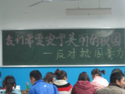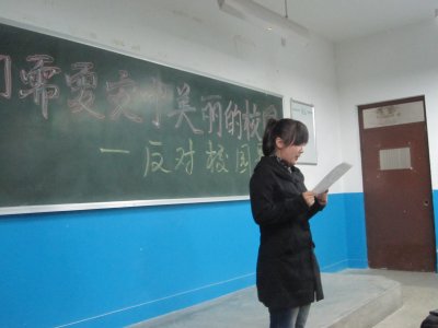 刘盼:同学们,小时候读三字经,书中有:“为人子,方少时,亲师友,司礼仪”。朗朗上口的诗经不无道理。现在我们是新世纪的大学生,在国家、社会、家长、老师的关怀下成长。家庭为我们创造了上学的条件,学校尽力改善我们的学习生活状况。而在我们追求现代化教育时,言情、恐怖、枪械也充斥着我们的视野。许多电影电视中对于犯罪过程细节的描述成了不少青少年模仿的对象。一些同学随即各行其是,校园成为他们付诸实践的理想场所,校园不再安宁。此刻我们班级召开“我们需要安宁美丽的校园------反对校园暴力”主题班会。