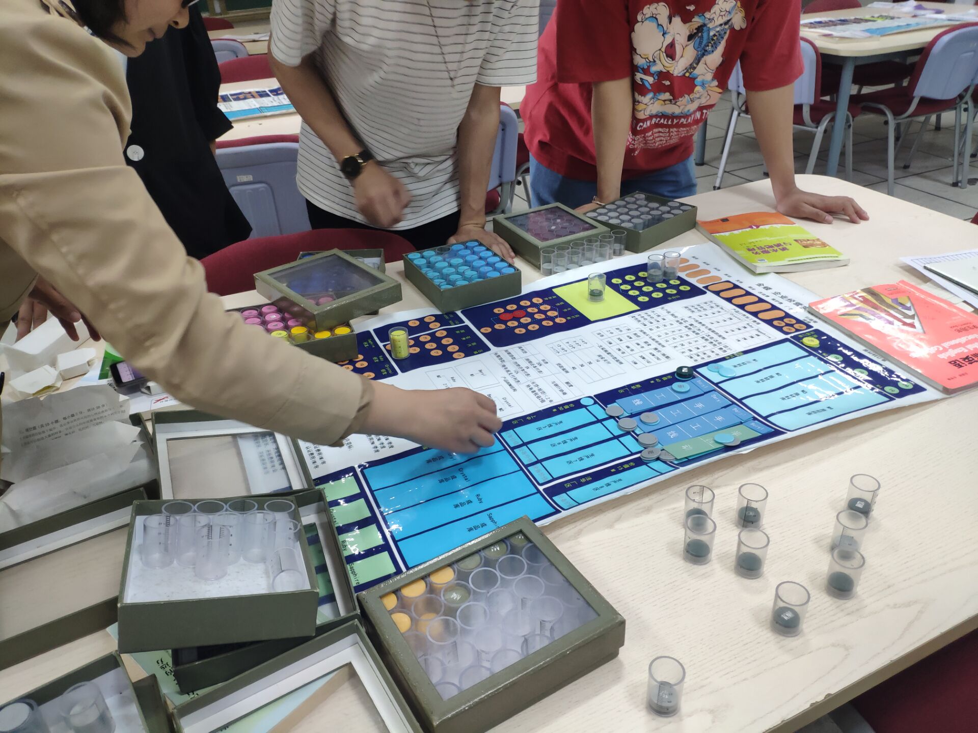 活动开始,隋老师对ERP沙盘进行简单介绍,ERP沙盘也称ERP电子沙盘,是企业资源规划。随后,隋老师带领同学们对ERP沙盘进行了模拟演练,模拟沙盘按照制造企业的职能部门划分了职能中心,包括营销与规划中心,生产中心、财务中心等。隋老师让学生们互相合作,共分成六组,每组五至六人,代表六个相互竞争的模拟企业,老师与学生们在模拟中的角色分工在沙盘模拟的各个不同阶段,结合具体任务,现场气氛为之活跃。