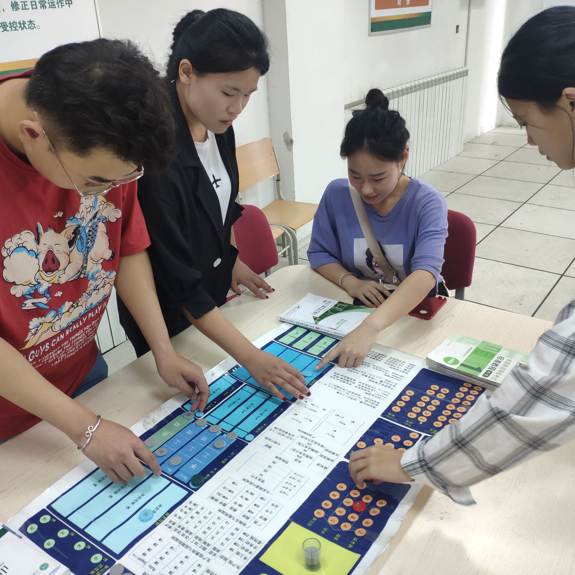 2019年5月16日工商管理学院组织部分学生会干事于F304进行了ERP沙盘摆盘学习。活动的指导老师是隋汝梅老师。