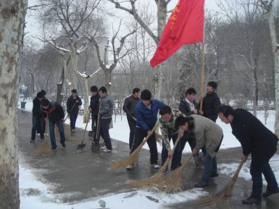 降雪在很大程度上影响了人们的出行,为了尽快清出一条道路,一大早,由各个学院团委老师带领本院学生会成员积极投入到扫雪活动中,大家热情高涨,干劲十足,为提高效率,后勤总务处及早备好了清扫工具,第一时间分发到学生手中。在这一活动中,工商管理学院表现的尤为积极和主动,通过天气预报得知会有降雪,工商管理学院昨晚已做了部署和安排,上班没多久,工商院学生会的扫雪队伍已集结完毕,由步老师和王老师带领第一时间出现在了校园的扫雪现场,此举得到了学校领导的好评。