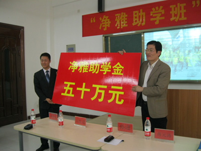 仪式上,蒋元涛院长代表学院对净雅食品股份有限公司无偿提供的第一年学费表示感谢,对受到资助的同学表示祝贺。蒋院长在仪式上详细阐述了“净雅助学”班产生的背景以及组建过程,希望同学们珍惜来之不易的机会,在校企双方共同努力组建的这一平台上加倍努力,感恩家长,回报社会。孙进经理代表企业向受到资助的同学们表示祝贺,同时希望同学们把握机会,努力学习。孙进经理还就校企合作模式、企业发展理念做了精彩的演讲。学生代表在发言中做出了“专心学习,勤于思考,珍惜机会,严守纪律,加强交流,增进交流,用实际行动回报学校、回报社会”的承诺。仪式上,孙进经理将五十万元助学金送给了“净雅助学班”。(文 姜庆军)