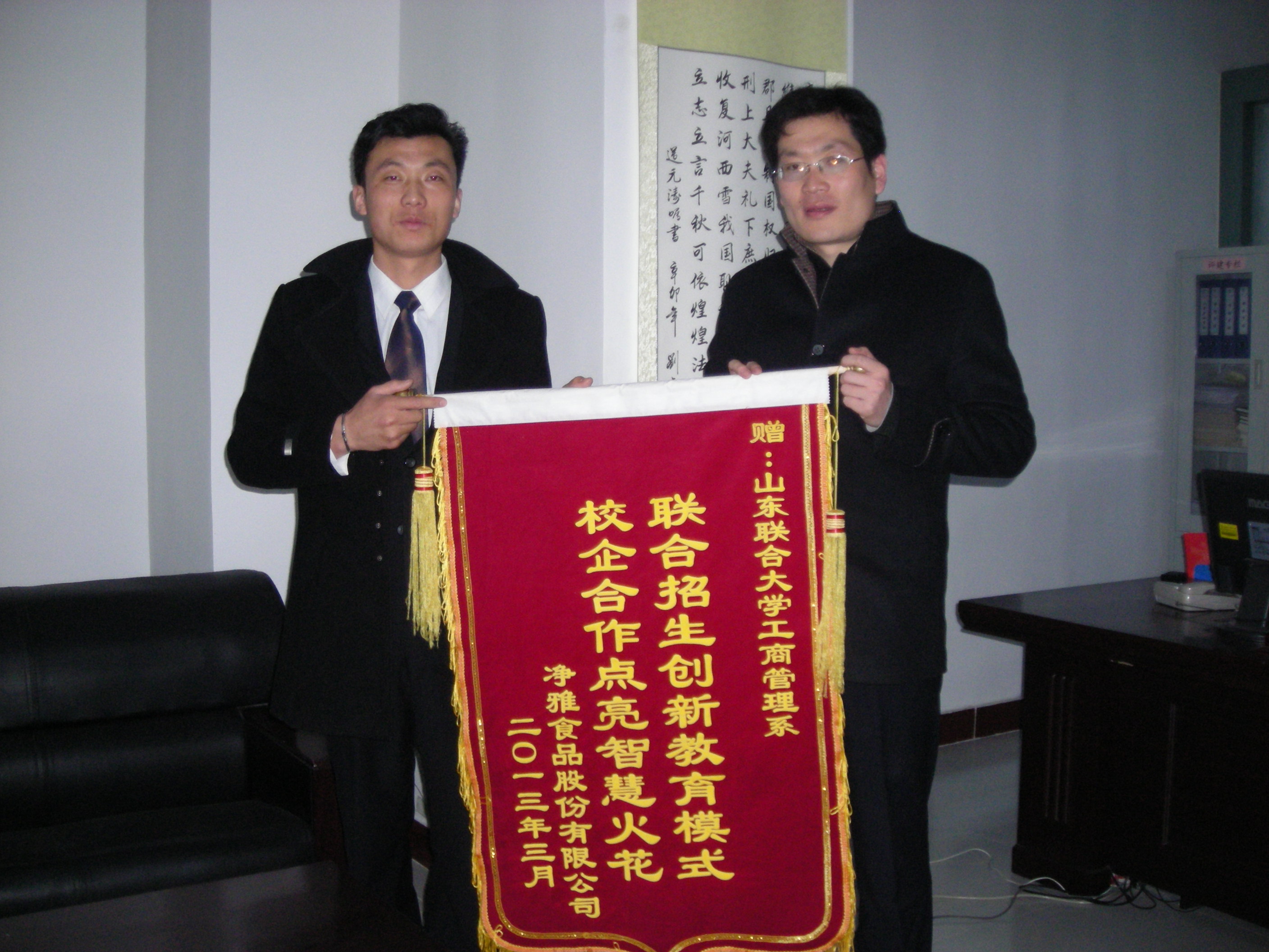 授课结束后,顾老师代表净雅集团将“校企合作”锦旗赠予工商管理学院蒋元涛院长。