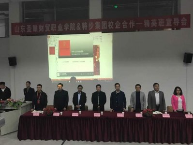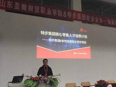 工商管理学院于二零一六年十月二十八日12:30在D4报告厅成功举办山东圣翰财贸职业学院与厦门特步投资有限公司校企合作宣讲仪式。参与此次宣讲仪式的嘉宾主要有厦门特步投资有限公司副总经理刘万青先生、零售总监刘召荣先生、人力行政经理刘国然先生、人力主管张倩女士、特步大学叶新金老师,山东圣翰财贸职业学院常务校长戈进杰教授、工商管理学院刘逢晨院长、秦友林书记以及工商管理学院15级班级的全体学生。