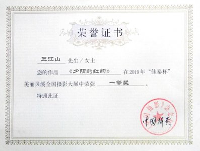 2019年5月27日山东圣翰财贸职业学院工商管理学院17级市场营销二班王江山同学荣获2019年“佳泰杯”美丽灵溪全国摄影大展一等奖。