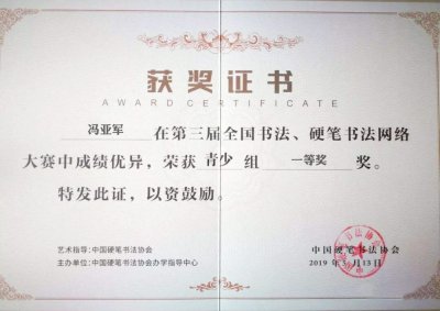 2019年5月13日山东圣翰财贸职业学院工商管理学院2017级市场营销二班冯亚军同学喜获全国书法硬笔书法网络大赛一等奖。