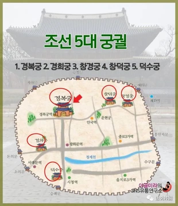 成立于公元1392年的朝鲜王朝,在定都汉阳(今首尔)后,陆续修建了五所宫殿:即景福宫(경복궁:临近韩国民俗博物馆)、昌德宫(창덕궁)、昌庆宫(창경궁)、德秀宫(덕수궁:临近首尔市厅)、庆熙宫(경희궁: 临近首尔历史博物馆)。虽然其中最著名、规模最大的是景福宫,但其实每个宫殿都有各自特点,都是朝鲜王朝六百年发展历程的见证,在不同历史时期都有各自的故事。
