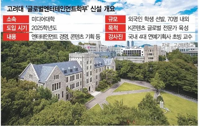 高丽大学相关人士表示:“美国纽约大学(NYU)、卡内基梅隆大学等海外名校早在很久以前就设立了娱乐专业。”他们还表示:“随着K内容在全球范围内的受欢迎程度不断提高,全球娱乐学部将招收来自各国的留学生,并致力于通过系统化的课程培养全球专业人才。”