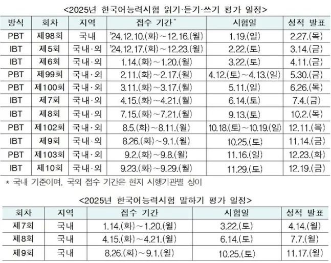 TOPIK I(听力、阅读)和TOPIK II(听力、阅读、写作)的评估将继续采用笔试(PBT)和IBT的方式,全年共计12次考试。同时,口语评估将仅通过IBT方式进行,每年举行3次。教育部下属的国立国际教育院韩国语能力考试中心表示,将为新增国家准备稳定的互联网考试环境,并进行试运行。