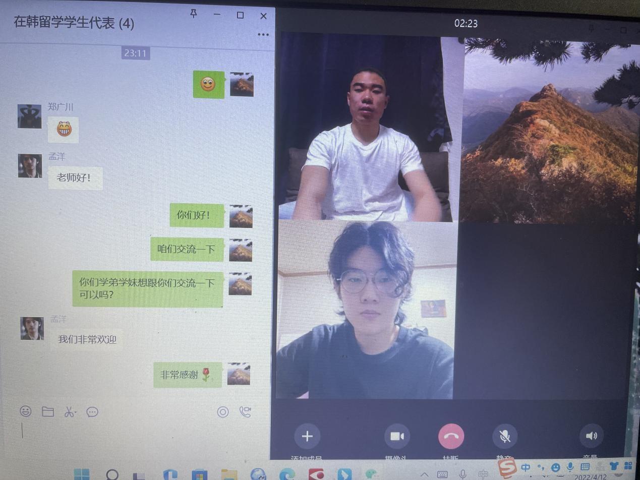 2022年4月10日,我院教学秘书周洪熳组织日韩留学班即将毕业的学生们同我院已毕业优秀毕业生代表进行了线上交流活动。同学们根据自己在韩国留学的自身经验,为日韩留学班的学弟学妹们讲述了在韩国的留学生活、留学经验、留学心得体会、在韩注意事项以及在出国申请中所应该注意的问题等,同时解答学弟学妹们的相关疑惑,使学弟学妹们受益颇深。