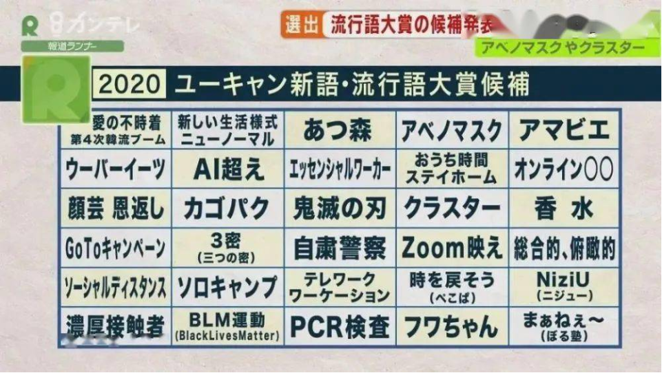 十大流行语中有一半与疫情相关,除了“三密”之外,“安倍口罩”、振兴经济措施的“Go To活动”、社交网站上受到关注据称能平息瘟疫的妖怪“Amabie”,以及形容在网络上进行远程教学、远距离工作等现象的“在线○○”,也都榜上有名。