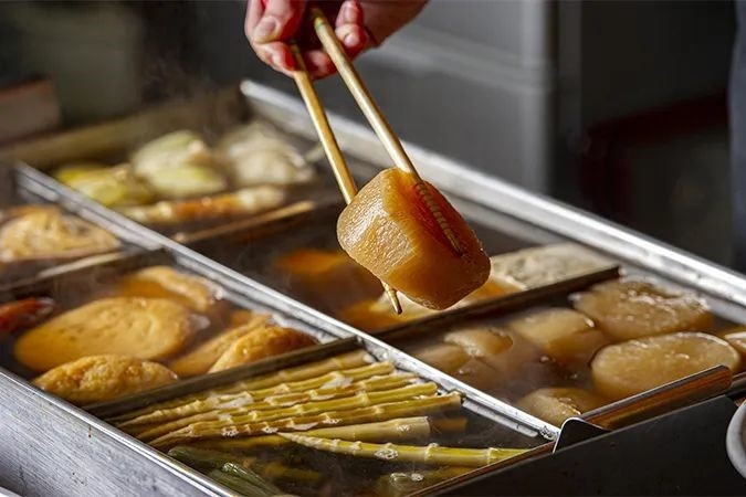 关东煮可说是经典的大众庶民料理,将鸡蛋、萝卜、蒟蒻、海带结、鱼浆制品等各式随手可得的寻常食材放入柴鱼、昆布萃取出的高汤里长时间浸润,吸足高汤精华的同时又能让同锅食材美味更加分。
