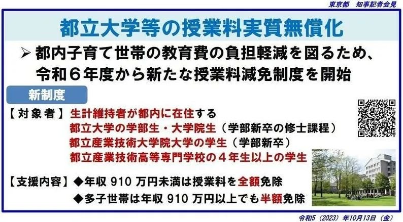 据日媒报道,本月,日本东京宣布东京都立大学、东京都立产业技术研究生院大学、东京都立产业技术高等专门学校的学费实质无偿化。从2024年度开始,对于年收入不到910万日元的住在东京都内的家庭,全额免除学费。