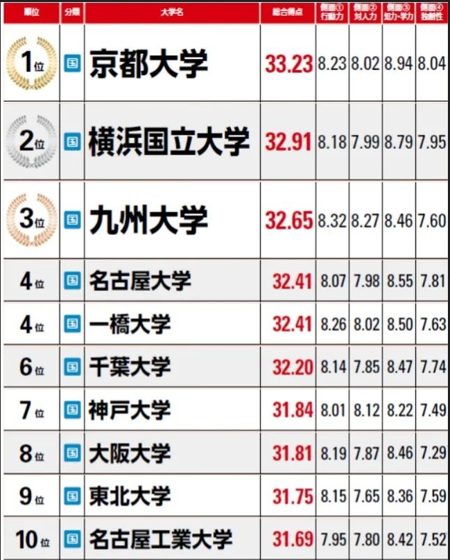 综合排名第一的是京都大学,较去年排名上升了一位。按项目划分,它的“智力和学术能力”(9.17)连续两年排名第一,其”独创性”以8.26分高居榜首。