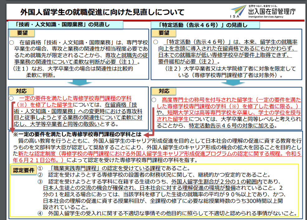 “特定活动(告示46号)”本来是为了提高留学生的就业率而设立的在留资格,但在日本就业率低的专门学校毕业无法满足该项在留的条件,因此需要放宽条件[大学毕业生或研究生院结业者限定对象(专门学校专业课程结业者不在对象范围内)。
