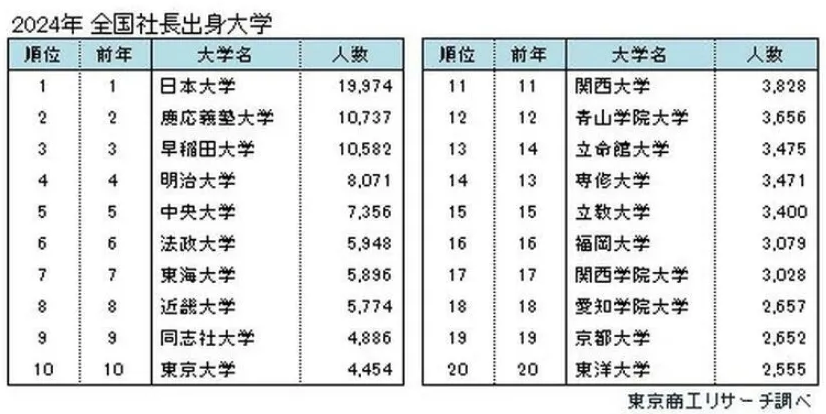 榜单中,“日本大学”以19,974名社长的数量位居榜首,紧随其后的是第二名“庆应义塾大学”,拥有17370名社长毕业生;第三名“早稻田大学”则有15820名社长。第四名至第七名分别为“明治大学”(8,071人)、“中央大学”(7,356人)、“法政大学”(5,948人)和“东海大学”(5,896人)。在西日本地区,排名首位的是第八名“近畿大学”,拥有5,774名社长,紧接着是第九名“同志社大学”,社长人数为4,886人。国立大学方面,第十名“东京大学”以4,454名社长名列前茅。