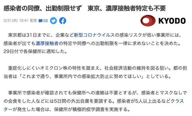 东京都政府在发给各地保健所的通知中称,由于奥密克戎病毒较少导致重症化,也为了维持正常的社会经济活动,对于企事业单位员工确诊新冠病毒感染后,一律不再要求保健所筛查其密切接触者,也不要求感染者接触过的人隔离。如果在一个区域内一起工作的同事,也不再要求其在家休息观察,允许感染者的同事照常上班。