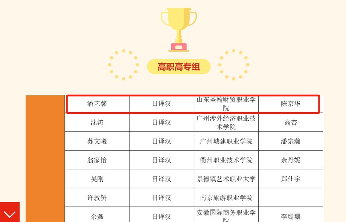 近日,由中国外文局亚太传播中心(人民中国杂志社、中国报道杂志社)和教育部日语专业虚拟教研室联合主办的第六届人民中国杯日语国际翻译(口笔译)大赛圆满落下帷幕。经过大赛评审委员会严格评审和层层选拔,国际交流学院日语留学班的潘艺馨同学斩获高职组三等奖。