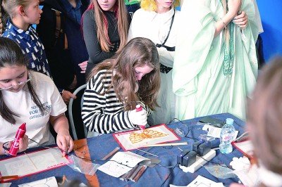 在俄罗斯首都莫斯科,一名学生在中文日活动上制作糖画。