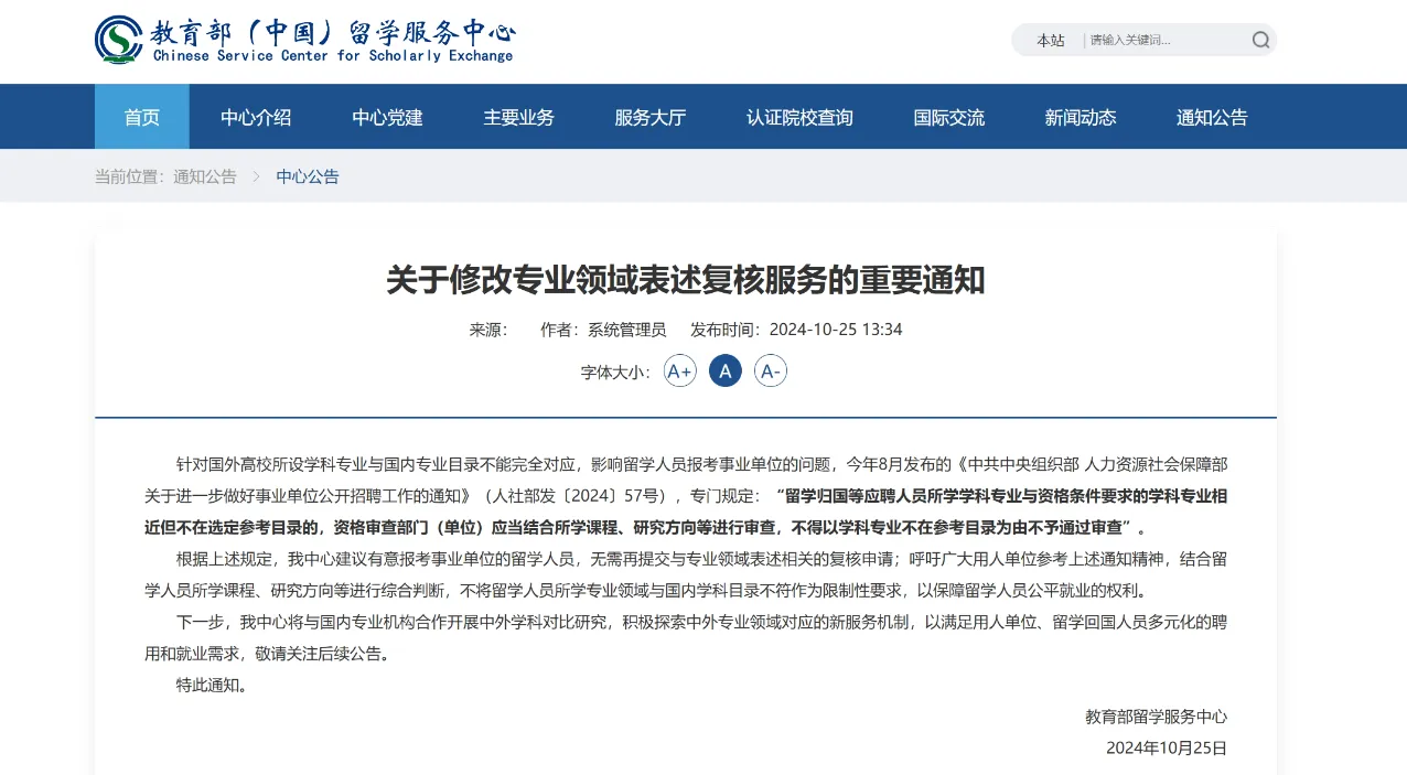 很多留学生回国后会选择考公考编,但是在填报专业的时候,经常会发现留服认证的文凭专业不符合考公考编的专业要求。造成这一现象的原因是国外大学的专业设置和国内大学存在差异,留服用直译的方式去认证专业,因此极易出现和国内大学专业不匹配的情况。针对这一情况,10月25日教育部留学服务中心在官网发布了“关于修改专业领域表述复核服务的重要通知。”
