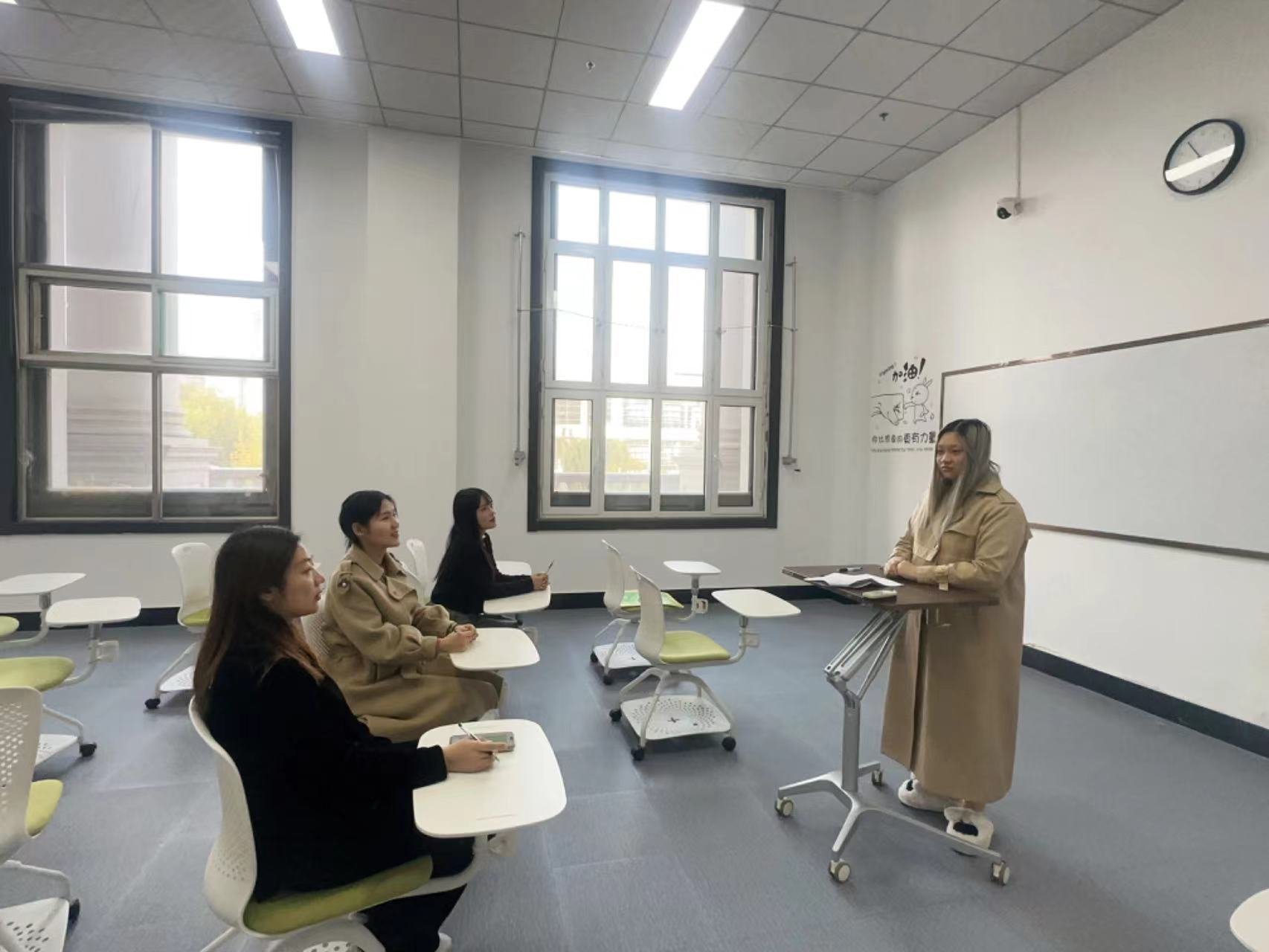在学校大赛服务与管理办公室、教务处的指导下,国际交流学院高度重视,指导教师王娜、徐男莹子、白薇带领参赛学生李婧雯于9月23日至10月31日期间,在吉纯楼202教室展开集中训练。指导教师倾囊相授、悉心指导,参赛学生也展现了不畏艰辛、敢于挑战的精神风貌,共同打磨参赛作品,并取得了优异成绩。国际交流学院紧跟时代脉搏,坚守育人初心,始终坚持“以赛促学、以赛促教”,为全校学生提供更多的交流实践平台,全面提升学生的英语实际应用能力。
